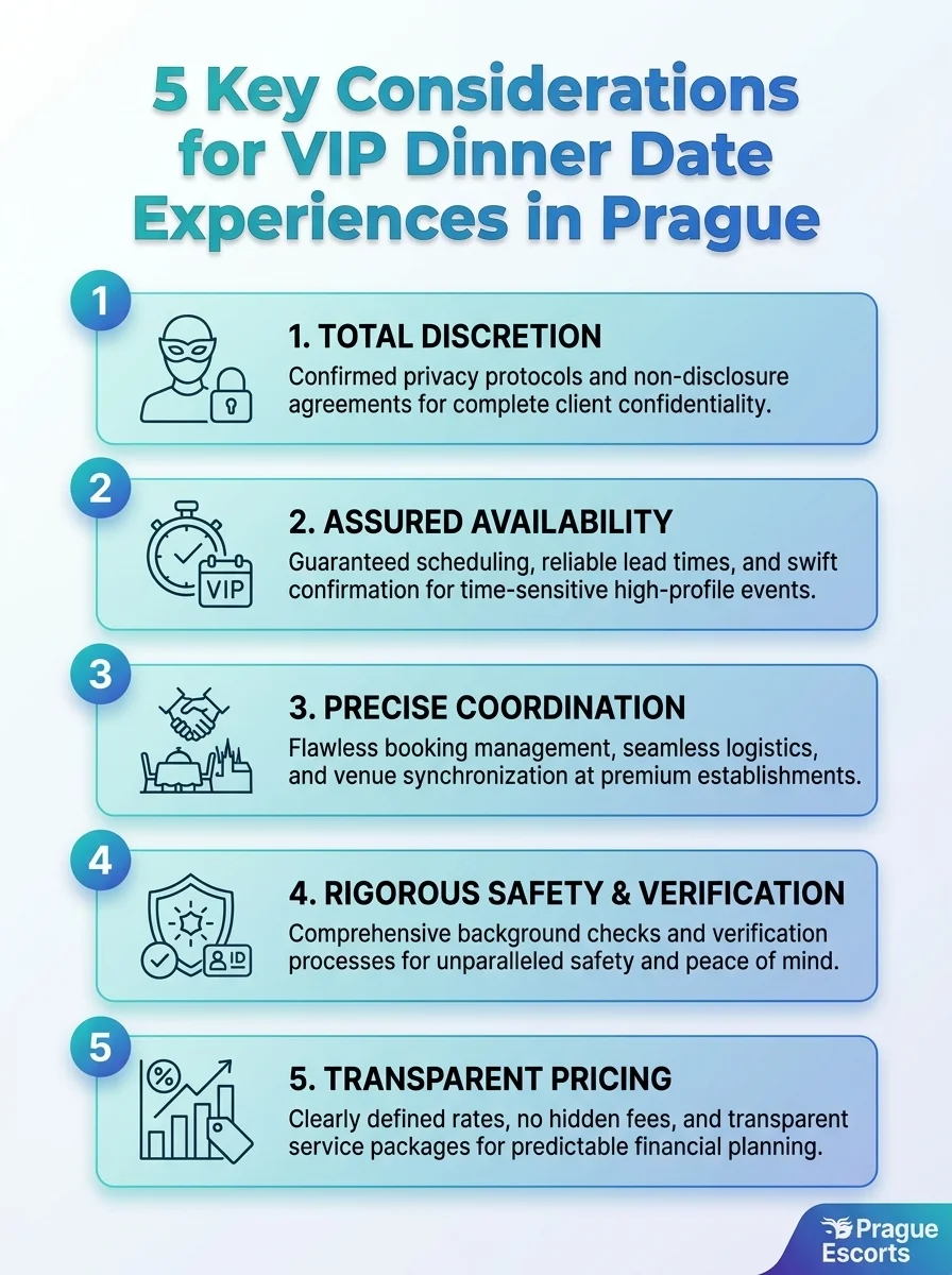 This infographic highlights the five essential factors for VIP dinner date experiences in Prague. It helps readers understand how to curate exclusive companions for Prague events.